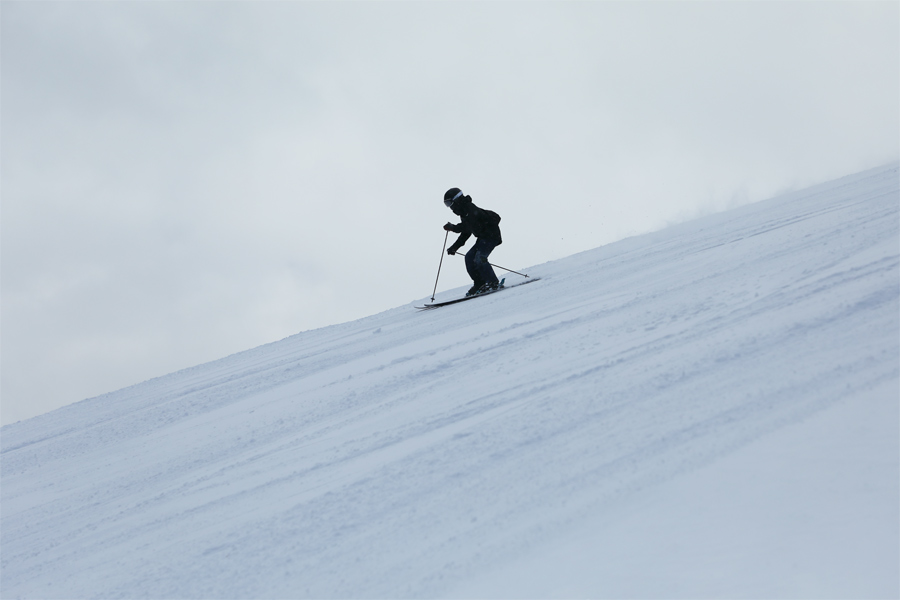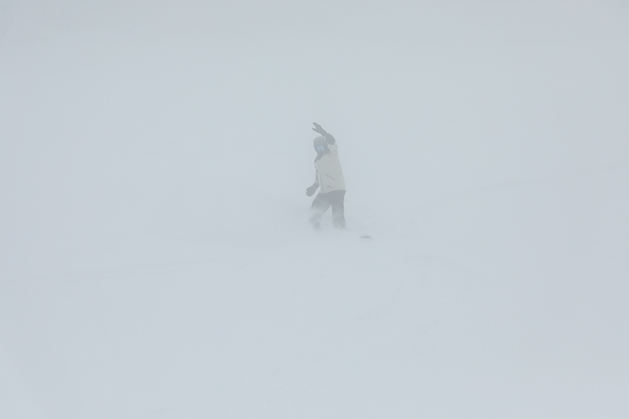 スキー場上部は雪の降り方が強い上に濃いガスも掛かり視界が効きづらかったです。適度に柔らかな粉雪の圧雪に軽い新雪が3~5cm乗った稗田山林間コースを滑り抜けて稗田山コース1(写真)へ。新雪は10~15cmと少なめながら下地の起伏も柔らかだったため気持ちよく滑れました。