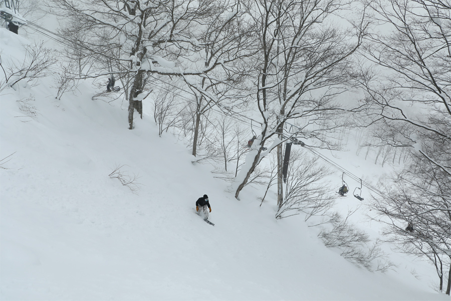 第4ペア沿いのツリーエリア(写真)では今朝もあちこちから歓声が上がっていました。新雪が10~20cm積もったツリーエリアには、ところどころに出た低木を避けて滑るに十分なスペースがありました。天気予報によると早くも次の寒波が今晩からやって来ます!