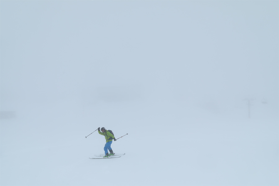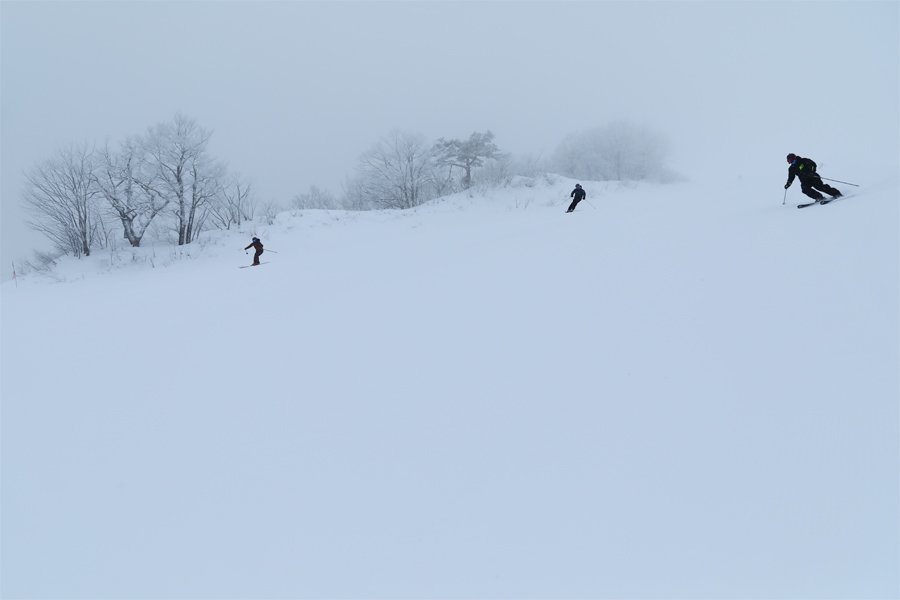 濃いガスに包まれていた黒菱で三重県からのスキーヤーさん(写真)が「いつも見てます!真っ白な中での取材で大変ですね。バーンコンディションはいいですよ!」とお話しくださいました。軽い新雪が約2cm乗った兎平の南側ルートは良く締まった粉雪の圧雪、黒菱第2クワッド沿い(写真)は適度に締まった粉雪の圧雪でした。