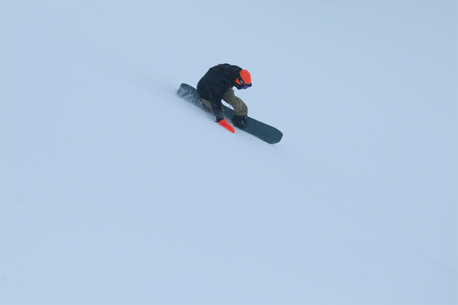 リーゼンスラロームコース(写真)は序~中盤が適度に締まった粉雪の圧雪、終盤のウスバゲレンデが粉雪に人工雪が混ぜられプレスされた硬めの圧雪。全体的に軽い新雪が2~3cm乗ったバーンで気持ち良くターンを切れば、ふわりと雪煙が上がりました。
