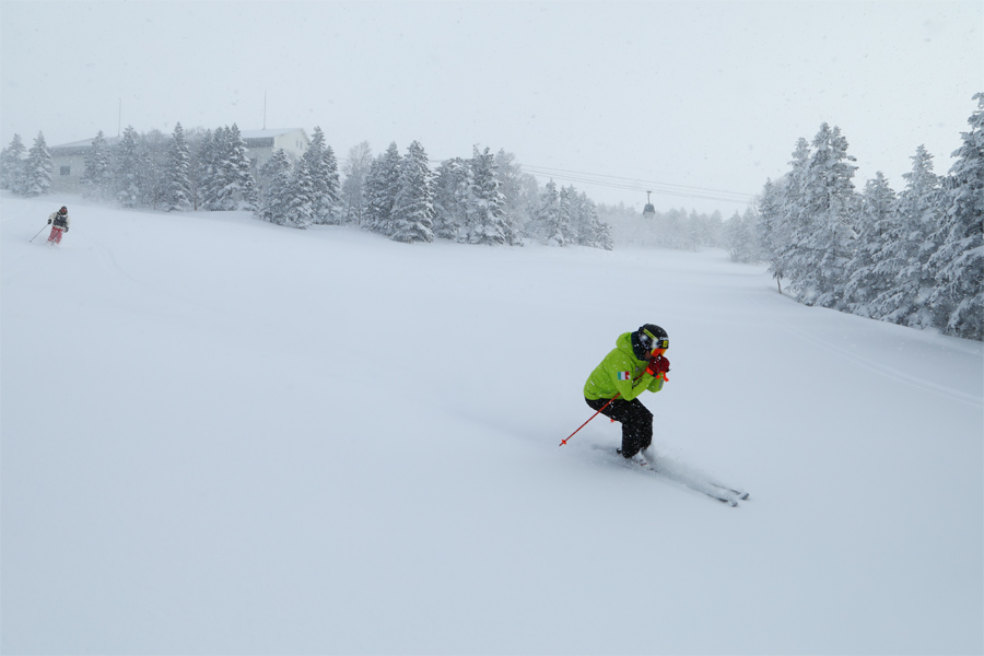 硬く大きな起伏が出来た YAKEBI COAST には約20~30cmの柔らかい雪の層がありました。雪が軽過ぎて浮力を得るのが難しくて、隠れた起伏にはじかれバランスを崩す場面も。その起伏をいなすようにして滑られていたスキー場のスタッフさん(写真)が「とても楽しいコースです!」とお話くださいました。
