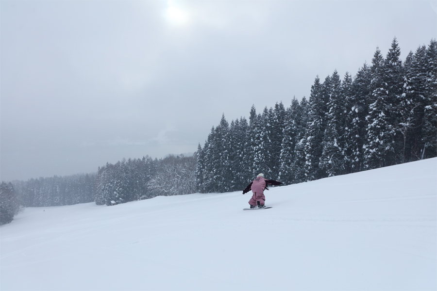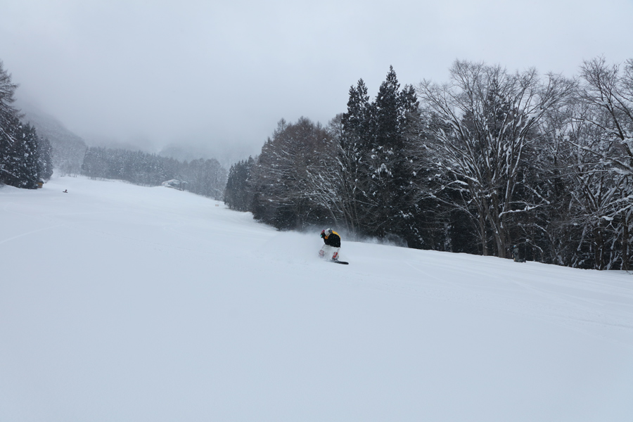 かと思えば、お2人目(写真)はグラトリで雪煙を上げながら颯爽と滑り降りて行かれるではありませんか。そういえば、板は OGASAKA Snowboard だし、JSBAのステッカーも貼ってあったし…、あなたたちは何者?ところで、2/1(日)はスキー競技会開催の関係でレイクダウンとレイクビューの一部が規制されます(PDF)。