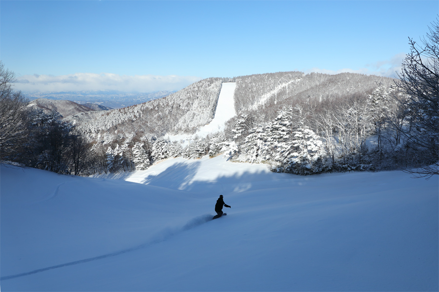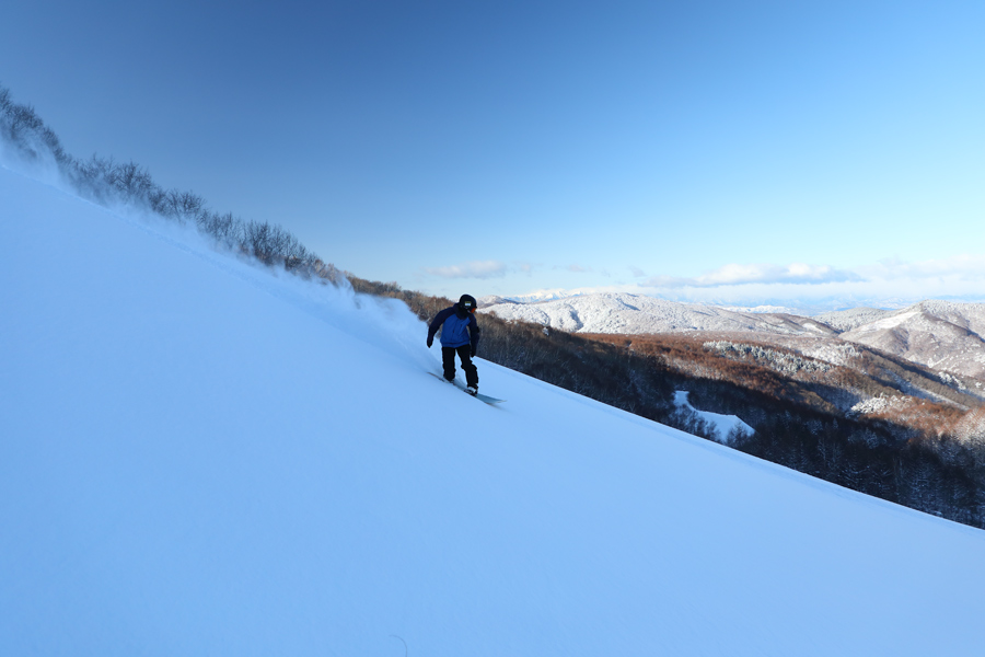 しかも NINJA リフト沿いの各コースは西向きで日陰になる時間が長いため、グッドコンディションがさらにキープされやすいという訳。適度に柔らかな粉雪の圧雪のドラゴ(写真)、ブラックビート、ゴマルコ、シンコウでは、エッジがしっかりと食いついて板が走り、思い通りのターンを切れました。