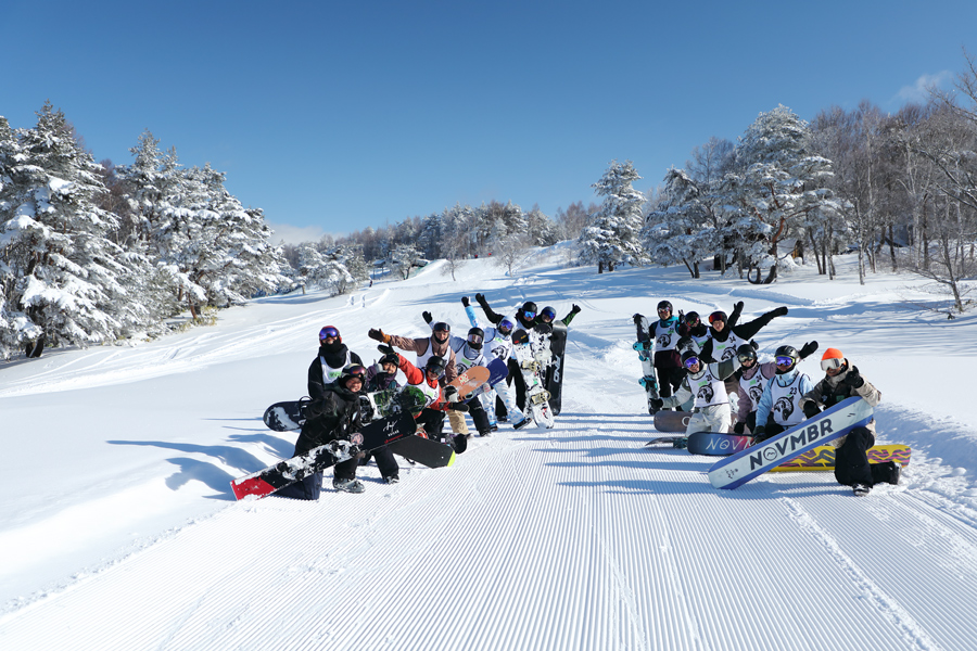 スマイルスノーボードスクール の「マスターキースノーボードキャンプ」が1/31(土)~2/1(日)の2日間に渡り行われていました。講師の角田翔プロ(写真左、一番手前)が「複数の滑走スタイルを1泊2日で集中的に体験できる特別なキャンプイベントです。僕がアルペンのレッスンを、鶴田真到プロ(写真右、一番手前)がフリースタイルのレッスンを担当します。」とお話しくださいました。