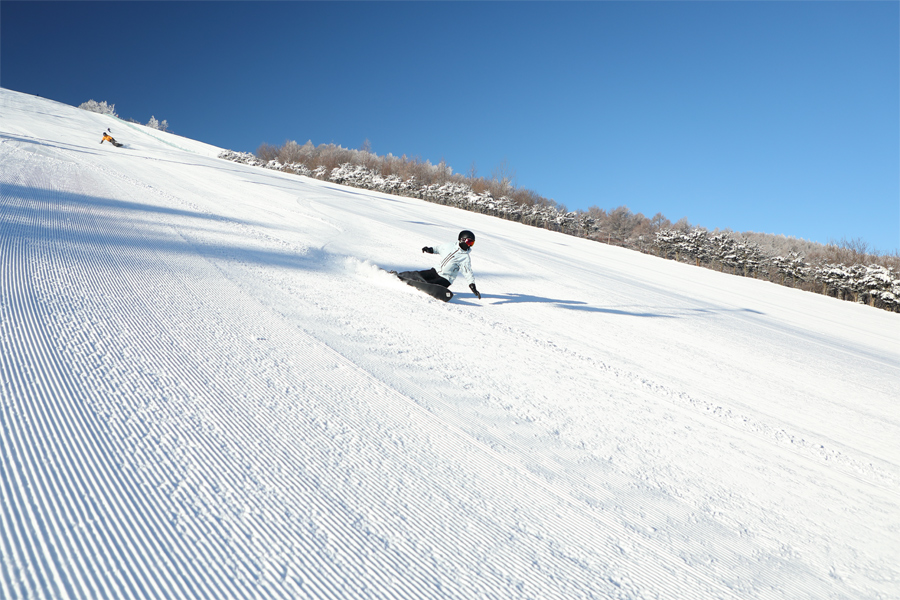 裏太郎ファミリーイーストとウェスト(写真)は適度に柔らかな粉雪の圧雪。エッジがしっかりと雪面を捉えて板が走りました。バーンコンディションの良さはもちろん、青空に霧氷の白が良く映える景色に気分がどんどん上がりました。