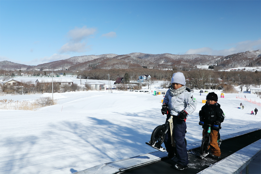 スマイルパークは9~12時と13~16時の2部入替制のキッズパークです(※一部あたり2歳以上@1,200円)。パーク内には全長40mの動く歩道(写真)があり、スノーストライダー、スノーレーサー、チューブといった各種そり、シャベル、バケツ等の無料の雪遊びアイテムが取り揃えられています。