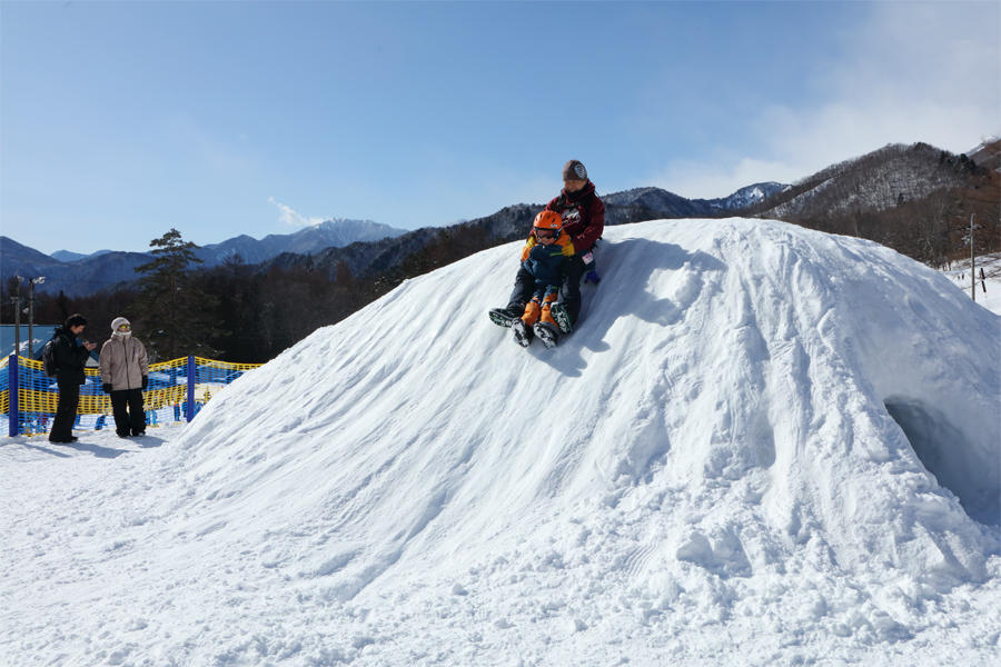 キッズパークの一角を占める大きな雪山(写真)は、よじ登ったり滑ったりして楽しめます。両サイドに掘ってある穴から中に入ればかまくら気分も。今朝の圧雪コースは全てが粉雪コンディションで、適度に締まり板が走って滑りやすかったです。