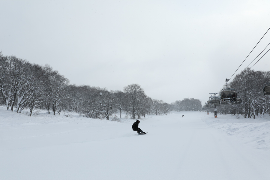 スキー場の中腹ではガスが濃くなったり薄くなったりを繰り返していました。レイクビューコース(写真)もクワッドコースと同様に適度に柔らかな粉雪の圧雪。日曜日とあって来場者の出足が早く、頂→クワッド→レイクビューは早い時間から人気でした。
