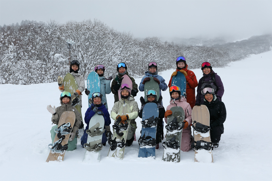 「スノーナビさん、良かったら『Women’s Snowsurf Camp』に参加の皆さんと撮ってください!」とはプロスノーボーダーの丸山春菜さん(写真手前左から3人目)。「1/31(土)~2/1(日)に女性限定の1泊2日フリーライディングキャンプを行っています。こちらは北原あゆみプロ(写真手前左から4人目)です。」とお話しくださいました。