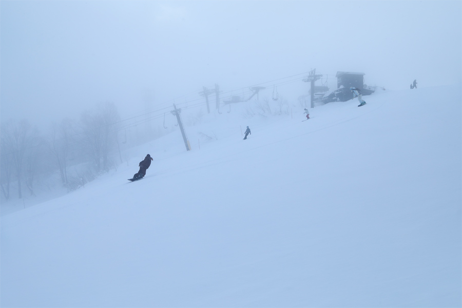 マウンテンサイドでは、8時半頃にガスが掛かり始めて視界がやや悪くなりましたが(写真)、足元から伝わって来る粉雪ならではの感触に胸が躍りました。乾いた雪が約1cm乗ったサウスゲレンデは適度に締まった粉雪の圧雪。朝一番にゴンドラを降りた人の多くが麓に向かって滑り降りて行きました。
