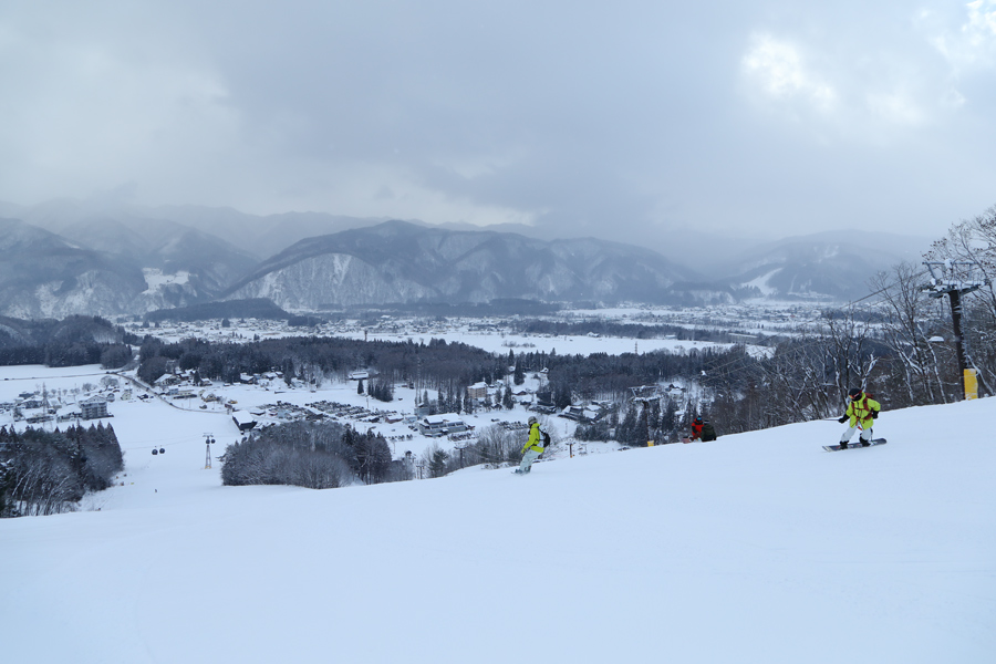 ビレッジサイドでは雲がかかったり解けたり、乾いた雪が降ったり止んだりを繰り返していました。日が陰ってフラットライトになると雪面が見えにくくなりましたが、どの圧雪コースも整備が行き届いていたため安心して滑れました。9時半頃のベースエリアに着いたシャトルバスについては降りる人も乗る人も多かったです。