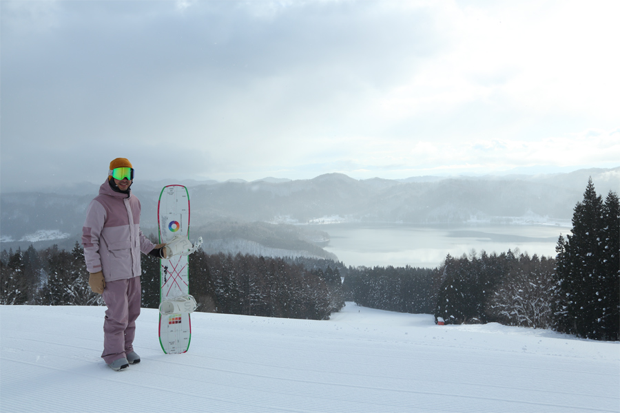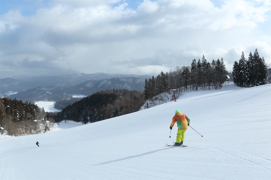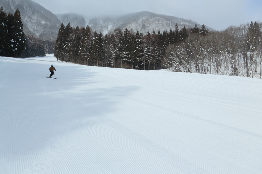 早朝に降っていた雪が8時頃に止み、日が差し始めました。「いつも見てます。今日は本当に滑りやすくてカービングが決まりますね。ちなみに、この板は THE DAY.HAKUBA の Banana or Pineapple です。」とは スノーリゾート信州 のレポーターさん。レイクダウン(写真)、レイクビューは適度に締まった滑りやすい粉雪の圧雪でした。