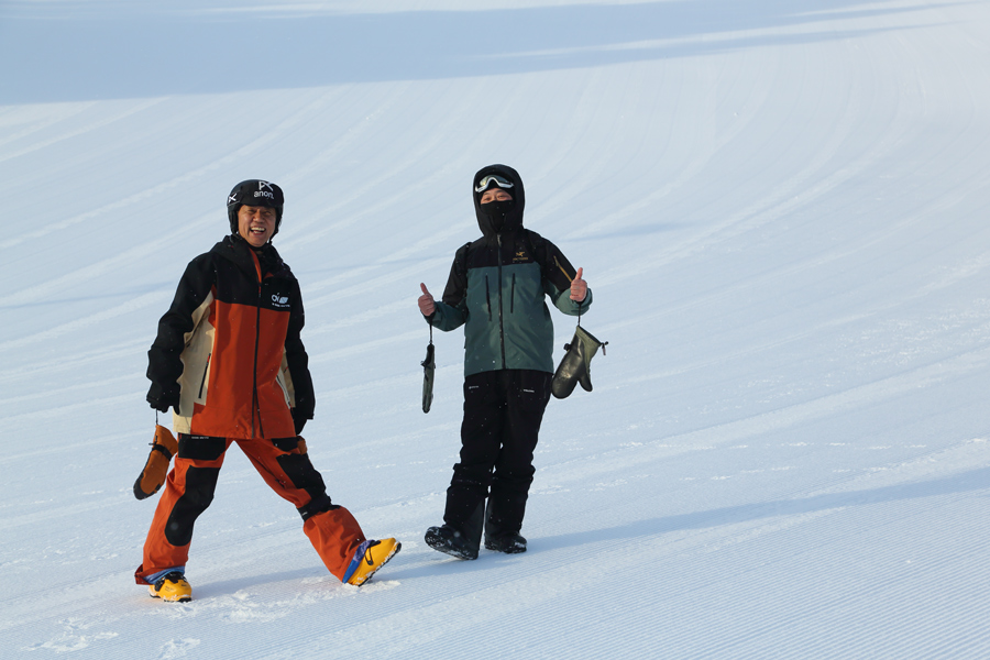 営業開始前に岐阜県からのお2人(写真)が「いつも見てます。今日は黒木誠プロのレッスンを受けに来ました。凄くいいコンディションなので楽しみです!」とお話しくださいました。カービングゲレンデ(写真)、パラダイスも適度に締まった、とても滑りやすい粉雪の圧雪でした!