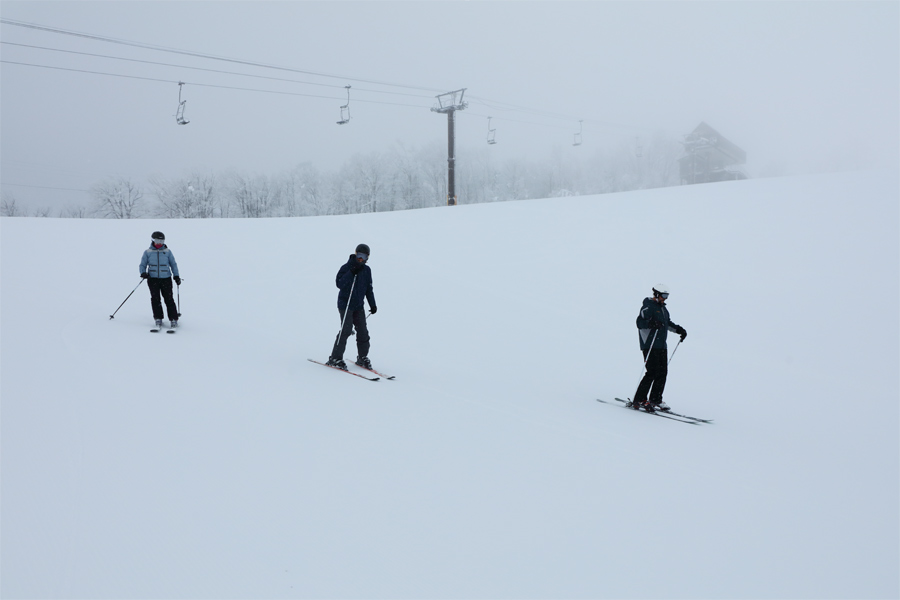 序盤の超緩斜面(写真)も斜度が増す中~終盤(写真3枚目)も適度に締まった滑りやすい粉雪の圧雪でした。写真左手の旧ヒルトップから軽い新雪約5cmを踏みながら滑り降りてくる姿も。少しかかっていたガスが中盤以降で解けて行きました。