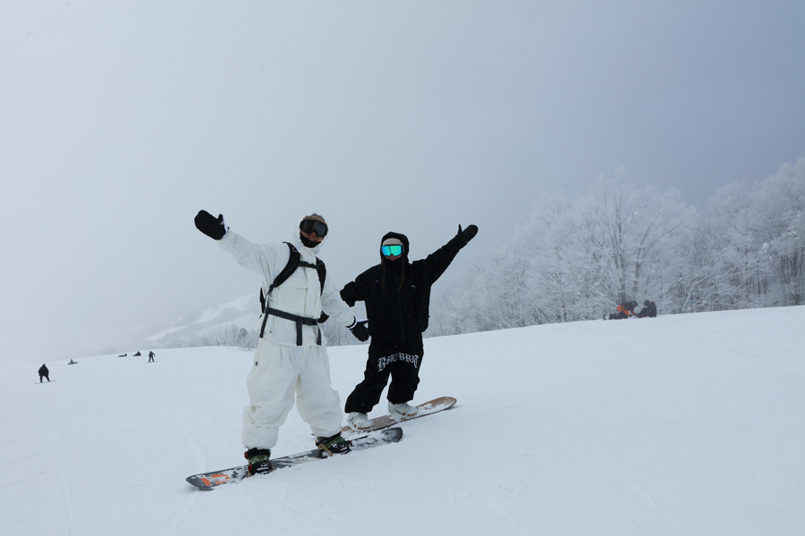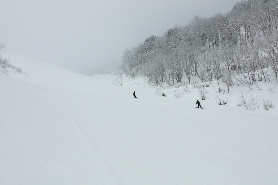 岐阜県からのお2人(写真)が「普段は奥美濃エリアで滑っています。月イチくらいで白馬、野沢、志賀等に滑りに来ています。岩岳は友達から地形が面白いと聞いて滑りに来ました。」とお話くださいました。軽い新雪が1~2cm乗ったサニーバレーコースは序盤がよく締まった粉雪の圧雪で、中~終盤が硬めの湿雪の圧雪でした。