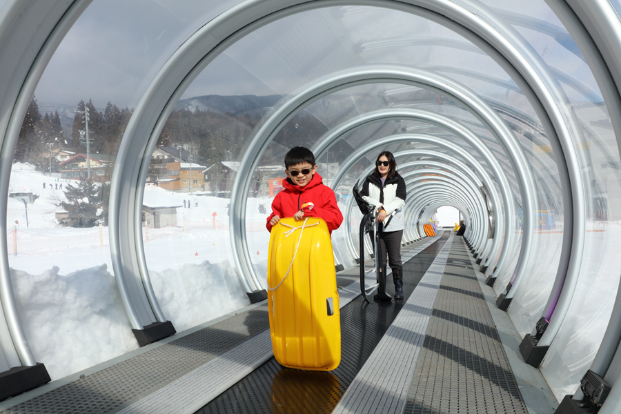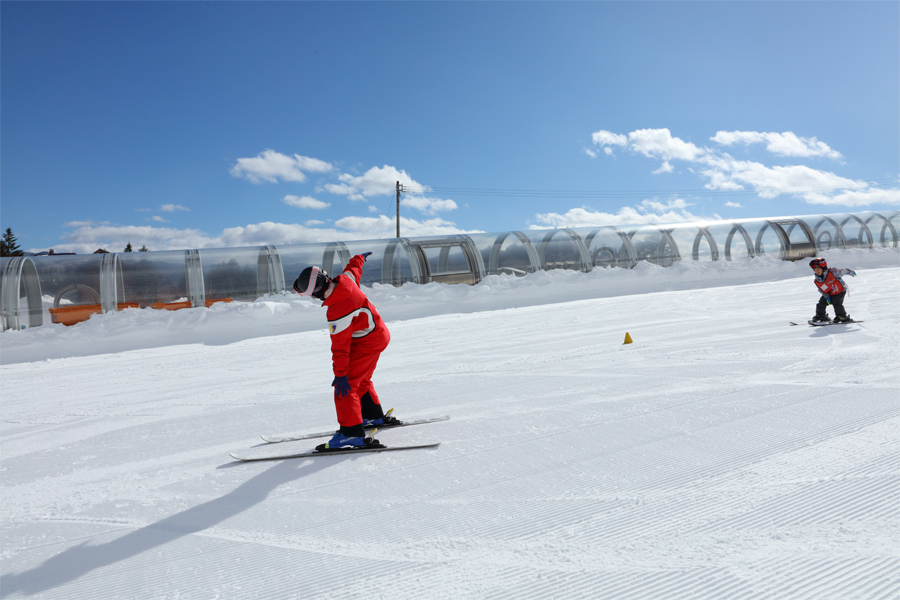 全長80mのムービングベルト(写真)は板を履いた形でも、板やソリを手にもった形でも利用可能。ドーム付なので雪の日も快適です。白馬八方尾根スキースクール の建物は、どなたでも利用できる暖かな休憩所、受付、更衣室、コインロッカー、授乳室、キッズスペース等を備えています。