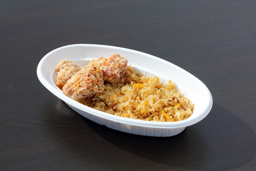 なきやまスノーランドの北側には「もぐもく広場」と称した、数台のキッチンカーを常設した広場があります。「安曇野食堂」の人気メニューは「炒飯&唐揚げセット」(写真、1,300円)と「餃子」(1,200円/10個)。日によってキッチンカーの台数やメニューが変わります。