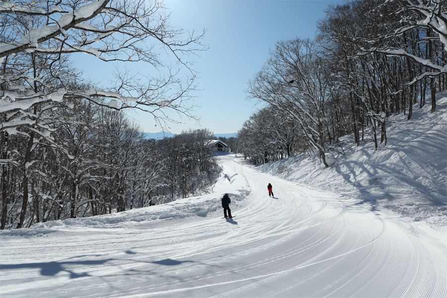 女子国体コースとチャンピオンBコースは、ホテルBと同様の粉雪コンディション。チャンピオンCコース(写真)は適度に柔らかな粉雪の圧雪でした。非圧雪のチャンピオンAコース(平均17°、最大32°、滑走距離1,200m)は、全面に出来た不規則な中~大サイズのコブが硬くなく、チャレンジしやすかったです。