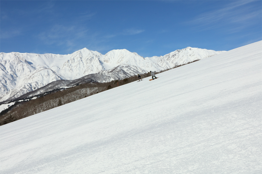 早いものでシーズンの約半分が過ぎました。1月に比べて寒さが緩み、天気が安定する2月~3月上旬は、積雪が十分なこともあって滑るにも冬山観光を楽しむにも良い時期です。2日連続となる穏やかな晴天のもと西方に望む白馬三山(写真)の白さが印象に残った朝でした。
