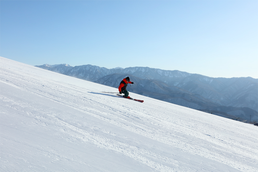 サウスゲレンデ(写真)とイーストゲレンデは適度に締まった滑りやすい粉雪の圧雪。特に開放感あふれるサウスゲレンデを大回りで滑れば爽快でした。サニーバレーコースは序盤がよく締まった粉雪の圧雪、中~終盤は硬めの湿雪の圧雪でした。