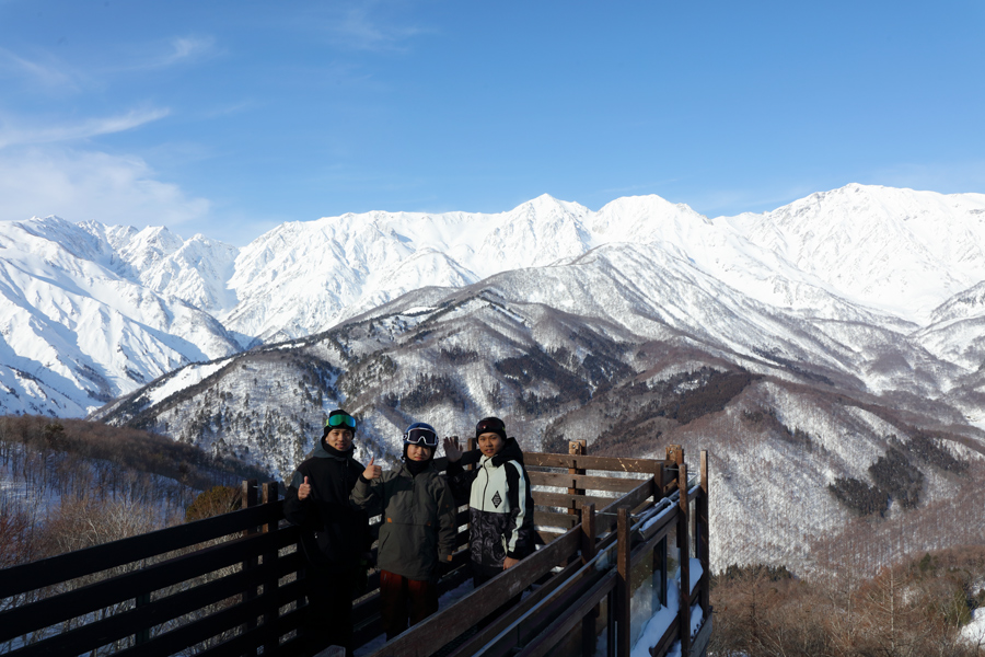 大分県からの3名様(写真)が「岩岳で滑れるのは今日だけの弾丸スノーボード旅行です。景色がきれいなので記念写真を撮りに来ました。」とお話くださいました。クッキーを焼く甘い香り漂うテラスは空いていて、ゆっくりできました。尚、THE CITY BAKERY の人気メニュー「白馬豚のクロワッサンサンド」(1,350円)など全3種類のサンドイッチは毎朝10時半から販売がスタートします。