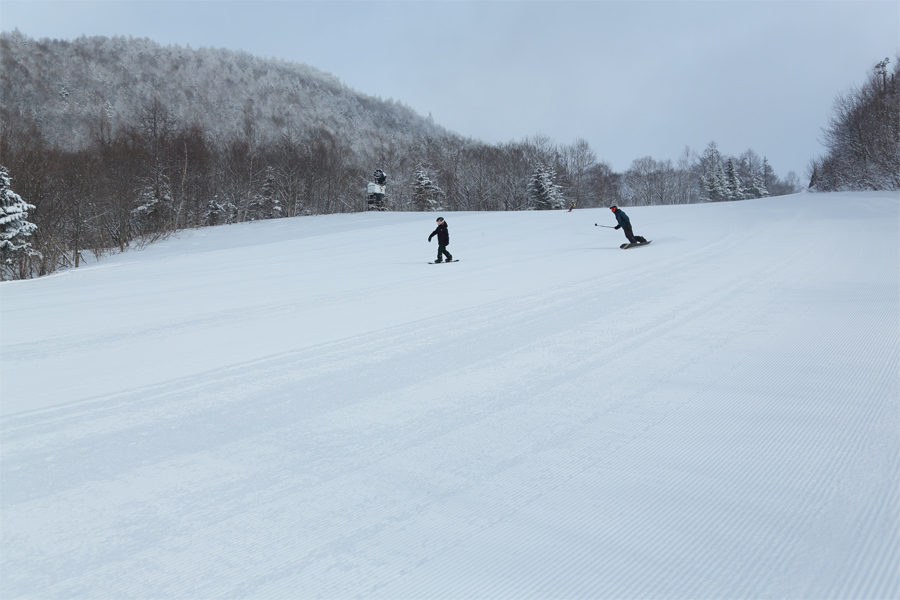 本日の1-Aは良く締まった粉雪の圧雪に軽い新雪が0~2cm乗ったコンディションでした。安曇野市からのお父さん(写真右)が「いつも見てます。今日は『上雪』だったのか、自宅に20cmくらい積もっていたので、雪かきしてから滑りに来ました。鹿島槍のシーズン券でほぼ毎週末滑りに来ています。」とお話しくださいました。