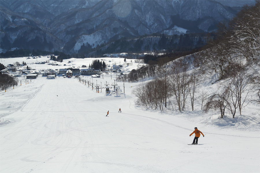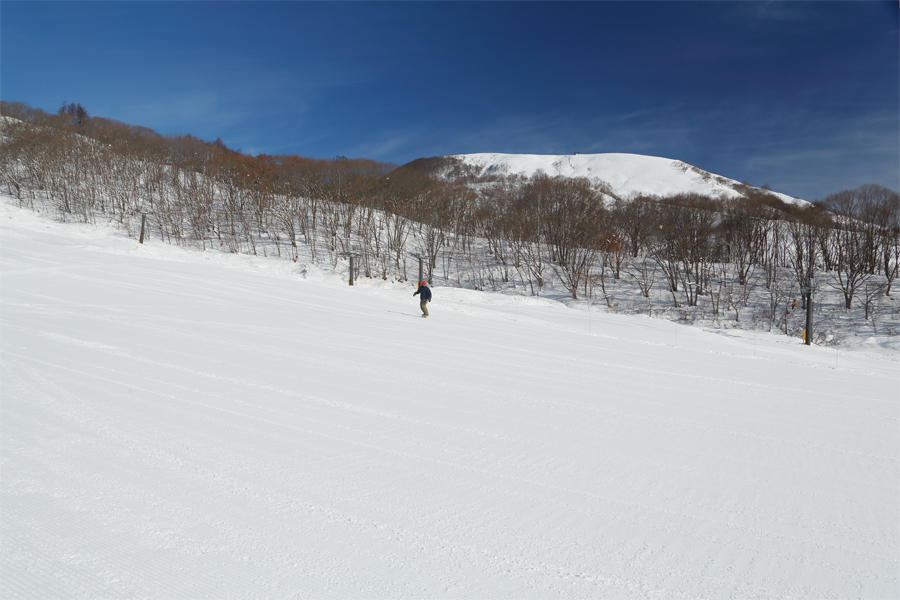 ワイドに圧雪の入った若栗中央ゲレンデ(写真)は適度に締まった粉雪の圧雪。平日の人の少ないフラットバーンで思い通りのターンを繰り返せました。良く締まった粉雪の圧雪のハイウェイコースとラビットコースも滑りやすくて、第3高速ペアか第5高速ペアで回したくなりました。