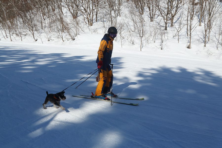 白馬村在住のスキーヤーさん(写真)が「いつも見てます。ハクノリ&コルチナ共通シーズン券ホルダーです。愛犬のスルを連れて初めて滑りに来ました。嫌がらずに走ってくれて良かったです、雪質も天気も最高ですね。」とお話しくださいました。スルちゃんは適度に締まった粉雪の圧雪のはくのりファミリーコースを元気よく走っていました。