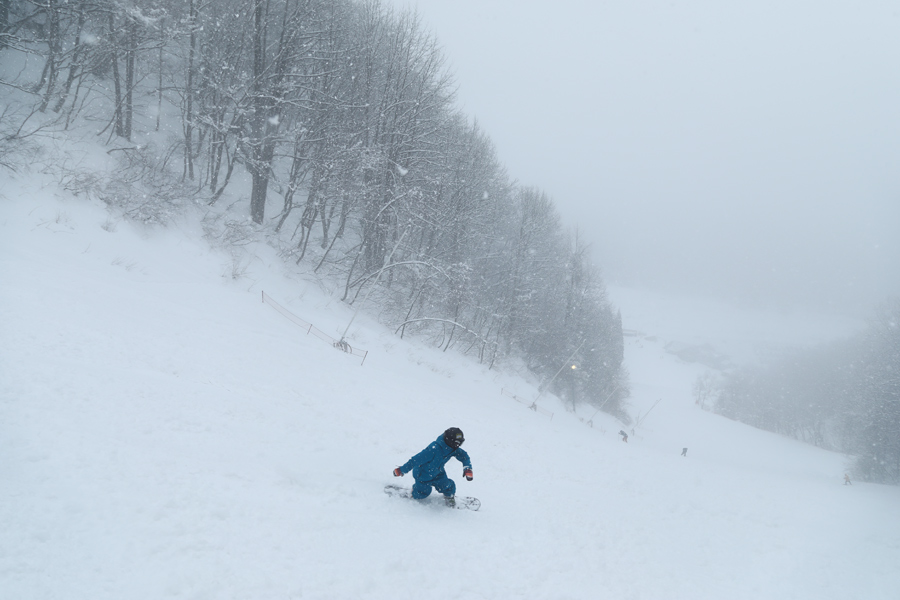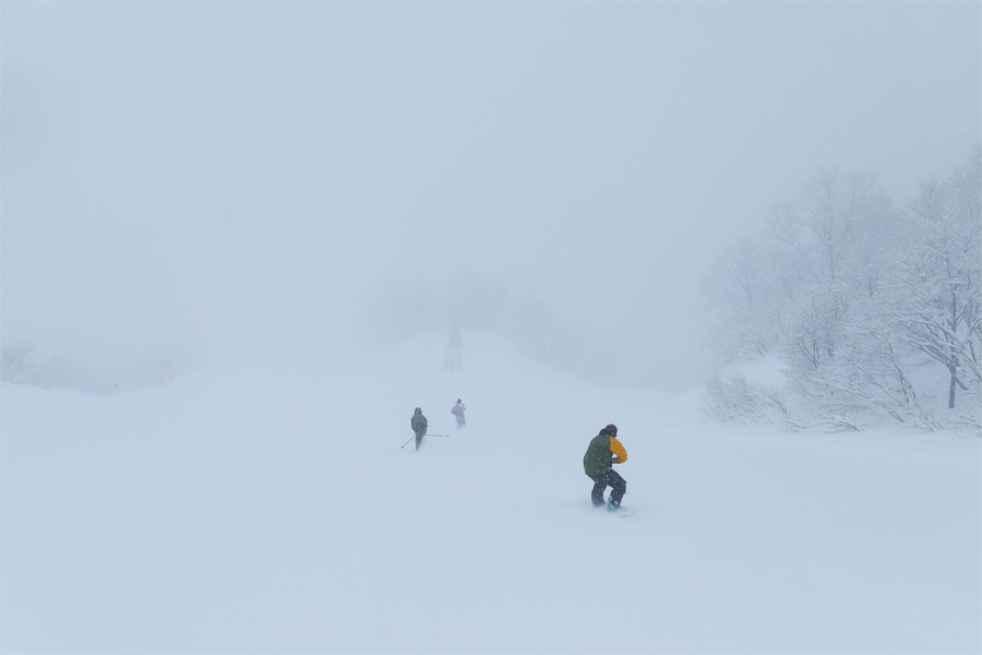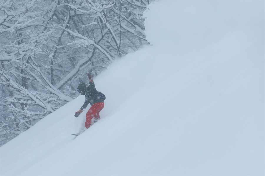 「スキー場上部の視界があまり良さそうじゃなかったので、コース幅が狭くて標高を稼げる よんなな にしました。」とは白馬村在住のスノーボーダーさん。適度に締まった粉雪の圧雪のルート2(写真)にはフカッとした新雪が25~30cm!思ったよりも軽い雪に「気持ちいい!」とつい声を出してしまいました。