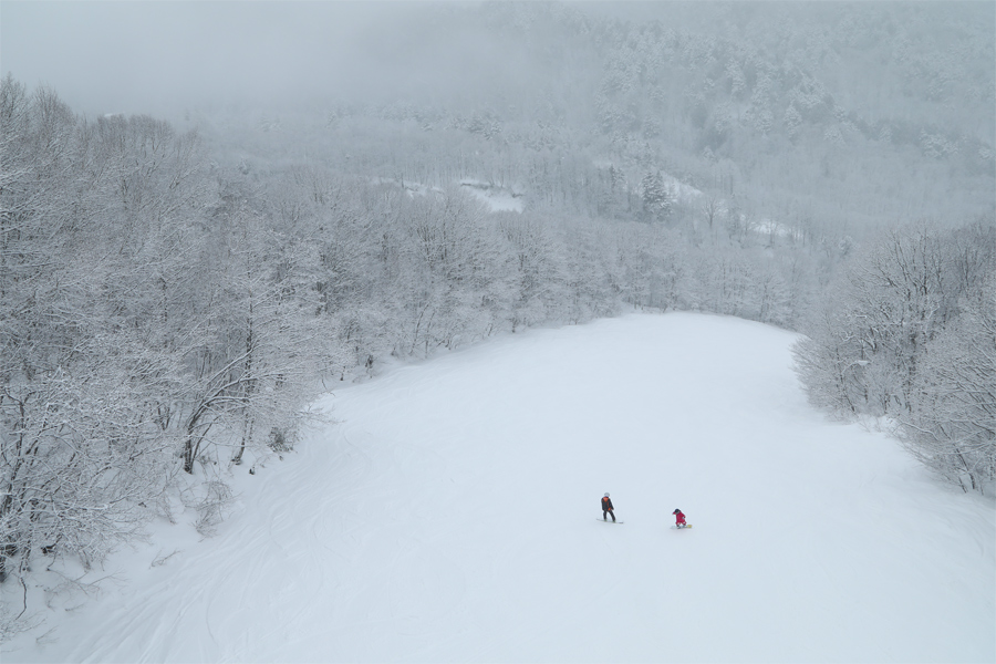 高天ヶ原クワッドを上り返して東館山林間コースからブナ平ゲレンデ(写真)に滑り込みました。コース幅いっぱいに圧雪が入ったブナ平ゲレンデには少し湿った新雪が5~10cm。フラットで適度に締まった圧雪と少量の新雪の組み合わせが気持ち良くて、なるべく板の面を意識して大きなターンで滑りました。