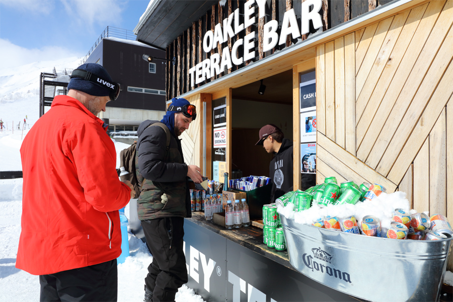 晴れて来たのを機に、以前から来たかった OAKLEY TERRACE へ。ここは晴れた日と週末の11~15時に「HAPPO SUMMIT MUSIC」が行われています。テラスにある売店(写真)では ハイネケン(800円)、チューハイ(1,000円)、イエーガー(700円)、レッドブル(500円)、エビアン(400円)等を販売しています。