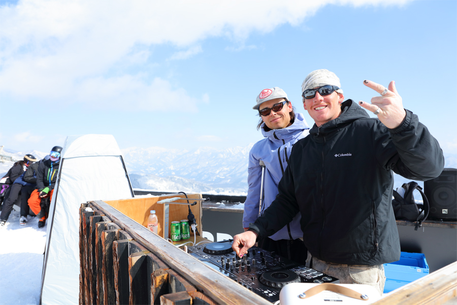 稜線にかかっていた雲が解けて来て、見下ろす麓の景色だけでなく北アルプスや、北方の峰々も望めるようになりました。絶景と外国人の多い異国情緒あふれる雰囲気、ノリの良い音楽が非日常感を演出してくれました。尚、焚火(写真中央)に火が入るため、寒い日は暖を取りながら過ごせます。