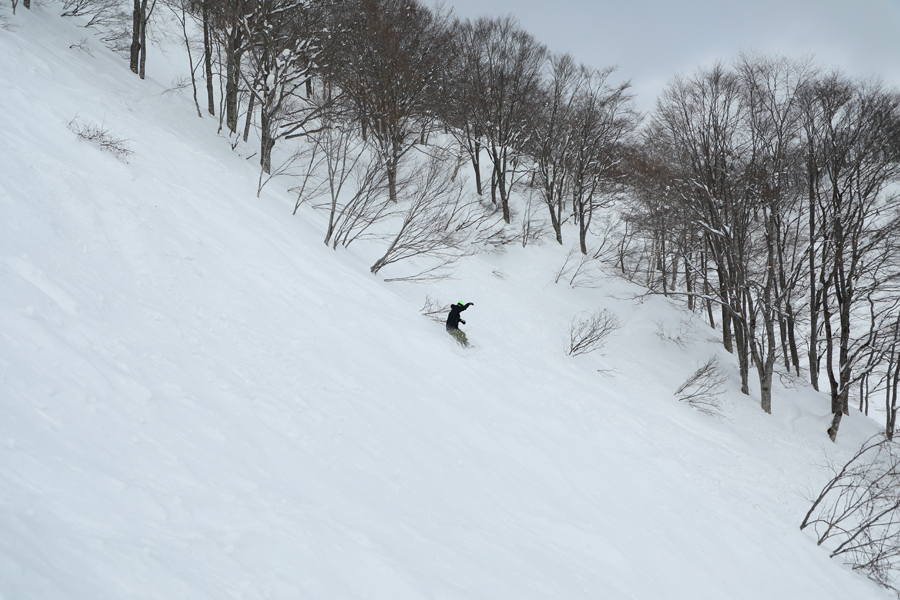 昨晩から今朝にかけて少し降った雪により、非圧雪部分にはカタクリ粉のような新雪が1cmほど積もっていました。昨日までにできた起伏が残っていたツリーエリアも、圧雪バーンと同様に柔らかな雪質が保たれていて滑りやすかったです。比較的開けた第4ペア線下(写真)から入り、2本目は木々の間隔が狭いエリアを滑りました。