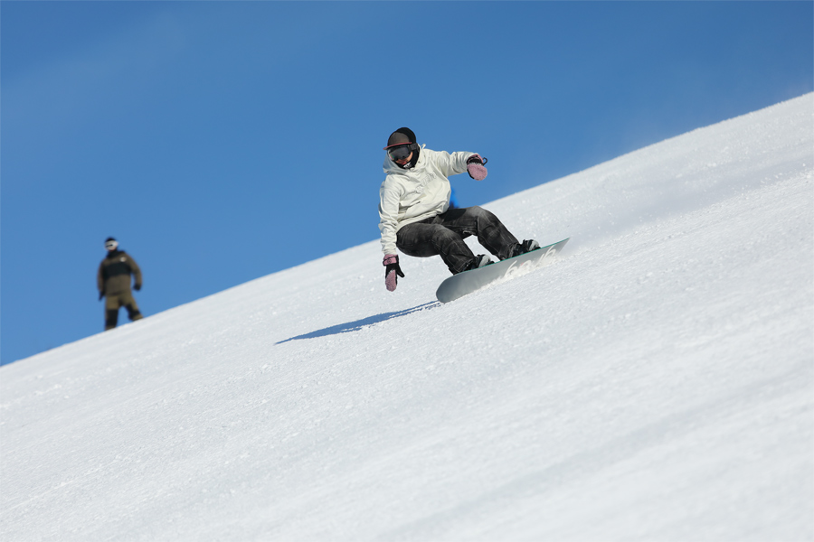 穏やかな快晴のもと放射冷却が効いた早朝はそれなりに冷え込みましたが、たっぷりの日差しによりすぐに過ごしやすくなりました。広く圧雪の入ったサウスゲレンデ(写真)は硬めの湿雪コンディション。小さな雪玉を見つつ思い通りのターンを繰り返せました。