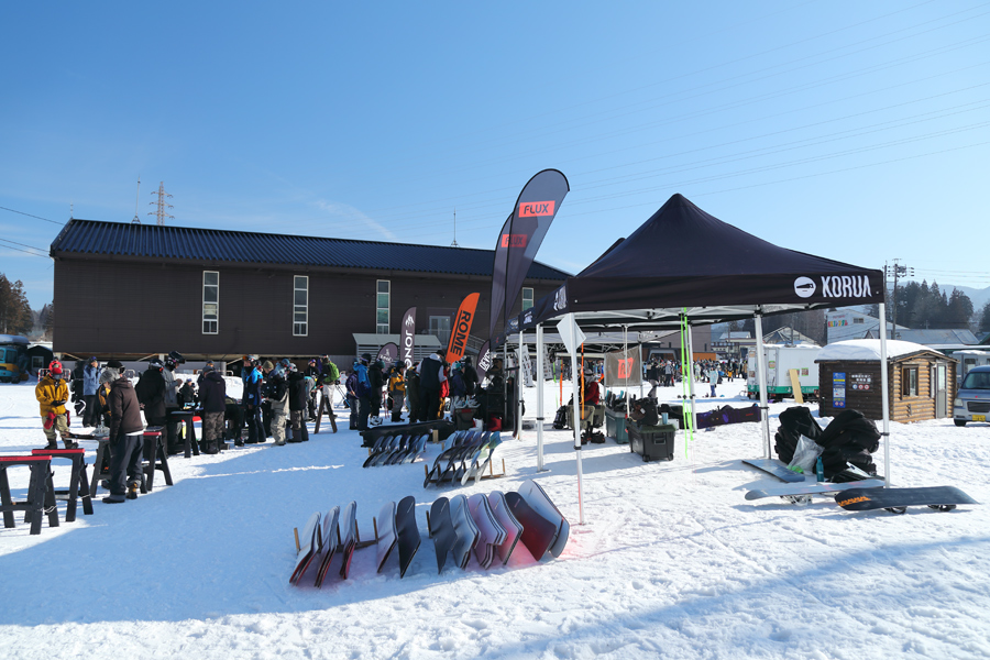 硬めの湿雪の圧雪のサニーバレーコースは日当たりの良い終盤の表面が早くも緩み始めていました。ベースセンター横で2/12(木)~2/15(日)に「26/27 NEW MODEL TEST RIDE」(※9時~、参加費無料)が行われています。スタッフさんが「来季モデルの板はもちろん、バインディングやブーツもあるのでこの機会に是非お試しください。」とお話しくださいました。