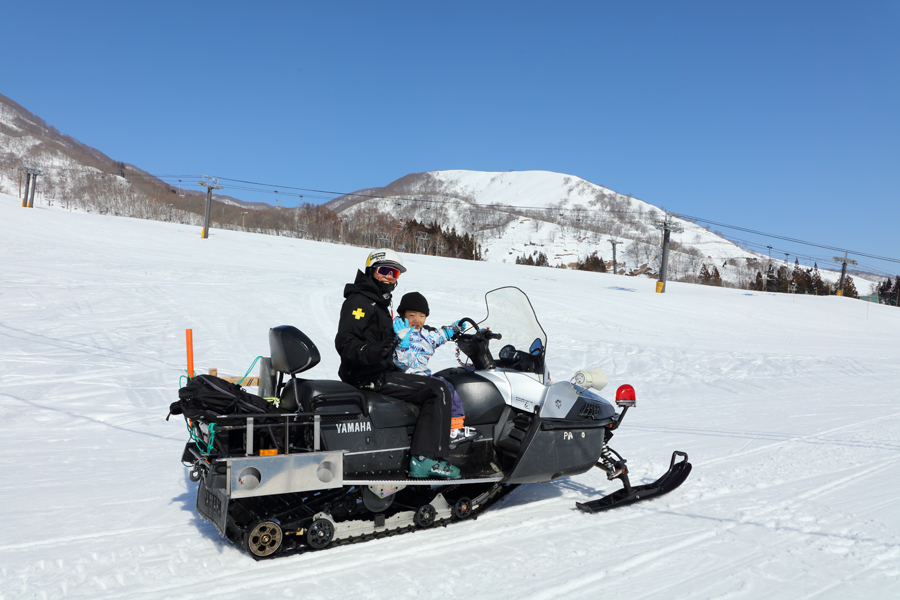 小学生の1日券が半額の1,750円になる毎月第3日曜日(※今月は2/15)に合わせて、ハクノリでは「キッズイベント」が行われています。内容はスノーモービル体験乗車(写真)、豚汁の振る舞い、バギーの体験乗車。大人気のスノーモービル体験乗車のコースはスノードロップ前~はくのりファミリーコース中盤の往復でした。