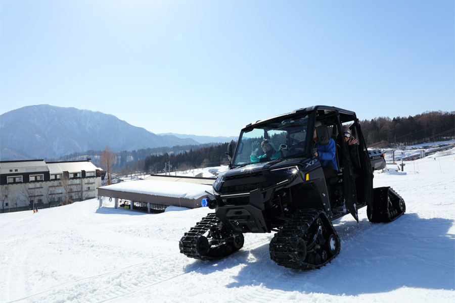 スノーモービル体験乗車の対象は小学生以下のお子さんですが、バギーの体験乗車(写真)は親子で乗車が可能です。岐阜県と群馬県からのご家族(写真)が「昨日から 白馬アルプスホテル に2泊しています。偶然『スキーこどもの日』に当たって良かったです。普段滑っているコースをバギーで走ると不思議な感じでした。」とお話くださいました。