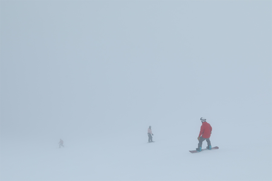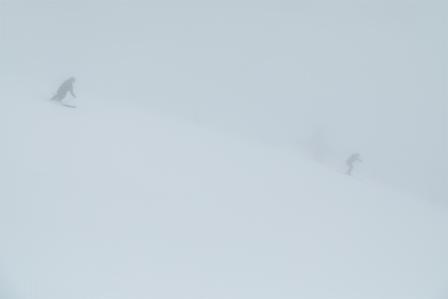来場者からは「真っ白で酔いそう。」「Too foggy!」といった声が聞かれました。新雪が薄っすら乗ったスカイラインコースの中央部分(写真)とパノラマコースは良く締まった湿雪の圧雪。スカイラインから滑り降りて行くと、良く締まった湿雪の圧雪の北尾根林道の中盤で雲下に抜けました。