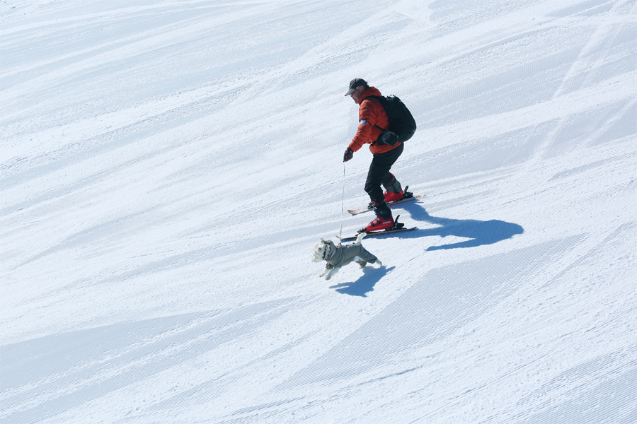 3連休最終日の2/23(月祝)に、ストリートスナップ ケイ(K)を見つけて愛犬を撮影してもらうイベント「ケイを探せ!!」が行われます。朝から雲一つない青空が広がった今朝は絶好の滑走日和、撮影日和。よく締まった湿雪の圧雪の Dog ではワンちゃんと一緒に滑る姿が数多く見られました。