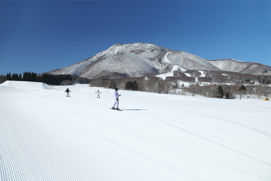 「山がきれいに見えますね。こんなにいいコースを貸切のようにして滑れるなんて最高です!」とは Weasel でレッスン中のインストラクターさん(写真一番右)。黒姫高原ホテル にお泊りの学生さん(写真奥)が「初めてのスノーボードで転びまくってお尻が痛くなったので、今日はサポーターを二枚重ねです。この後に行う『つま先側で滑る練習』は恐怖でしかありませんw」とお話くださいました。