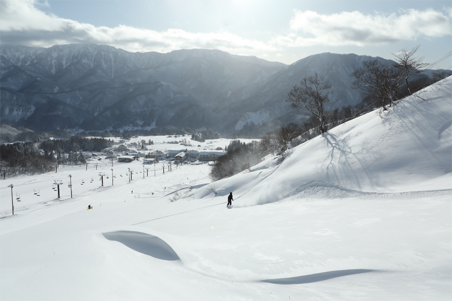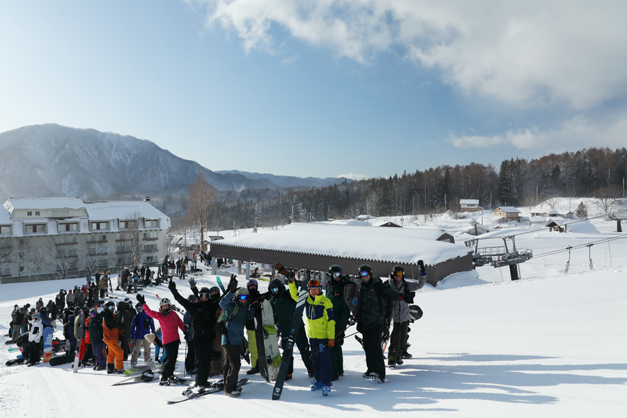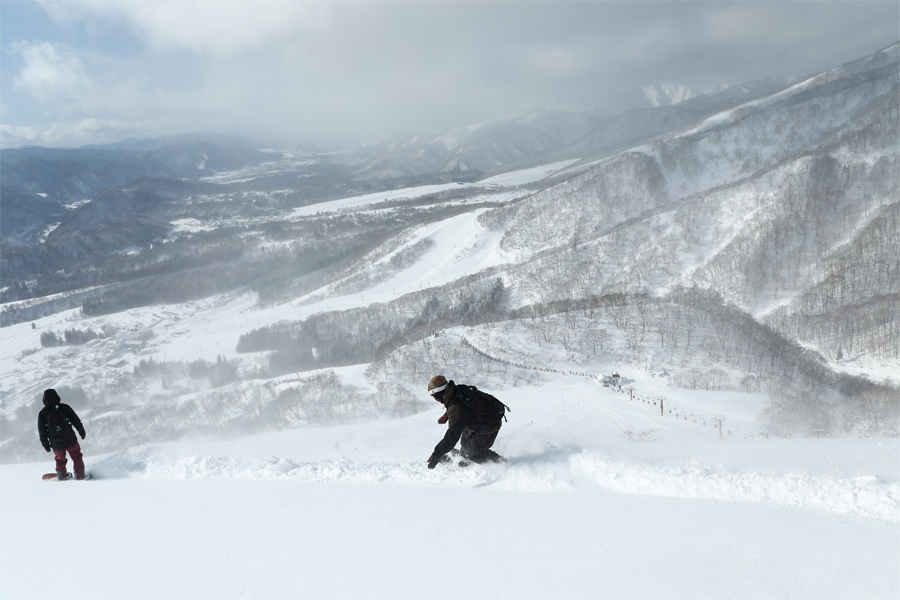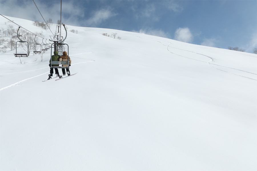 ひと晩の新雪でリセットされているかどうかと心配したスカイビューはご覧の通りの面ツルでした。硬めの起伏の上にフカフカの新雪が約30cm!コルチナの第4ペアが大混雑のため定刻より早く動くとの情報を受けて、ハクノリの第10ペア(写真)も15分早く、8時45分に動き始めました。
