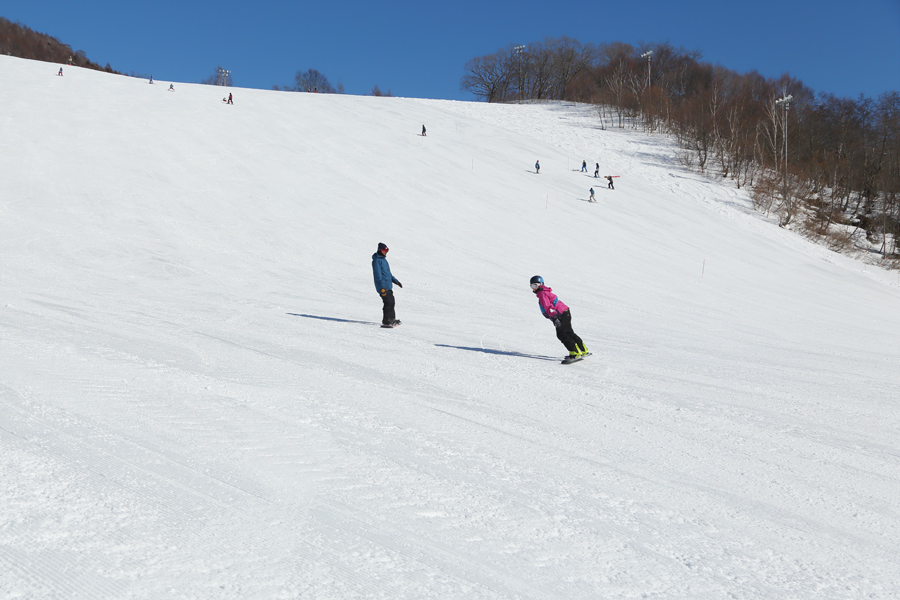 圧雪のコース1-A(写真)は序盤~中盤が適度に締まった粉雪の圧雪、終盤(写真)が良く締まった粉雪の圧雪。こちらは終盤が9時過ぎに緩み始めました。静岡県からのお父さん(写真左)が「いつも見てます。丁度良い緩み具合で滑りやすいですね。娘の練習にも良いコンディションです。鹿島槍には中部横断自動車道が開通してアクセスが良くなったので頻繁に来ています。」とお話しくださいました。