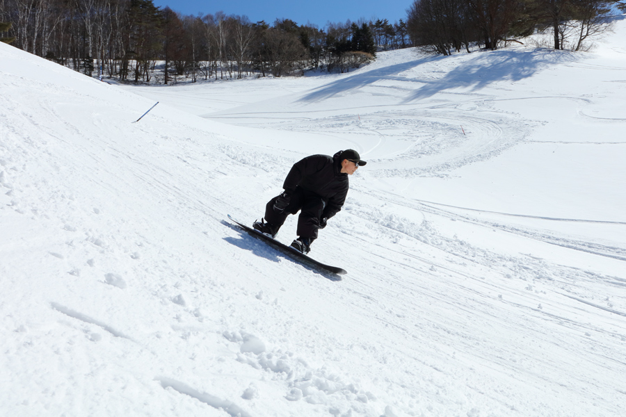 快晴、無風のもと8時半から「NINJA BANKD SLAOM」が行われました(※参加費6,500円)。ジュニア男子、ジュニア女子、ヤング男子、ヤング女子、マスター男子、マスター女子、レジェンド男子、オープン男子、オープン女子、スノースケート男女混合の10クラスに104名がエントリー。大会コースのシャイン(写真)は左右に振られるように滑れることから通称「振子沢」とも呼ばれています。