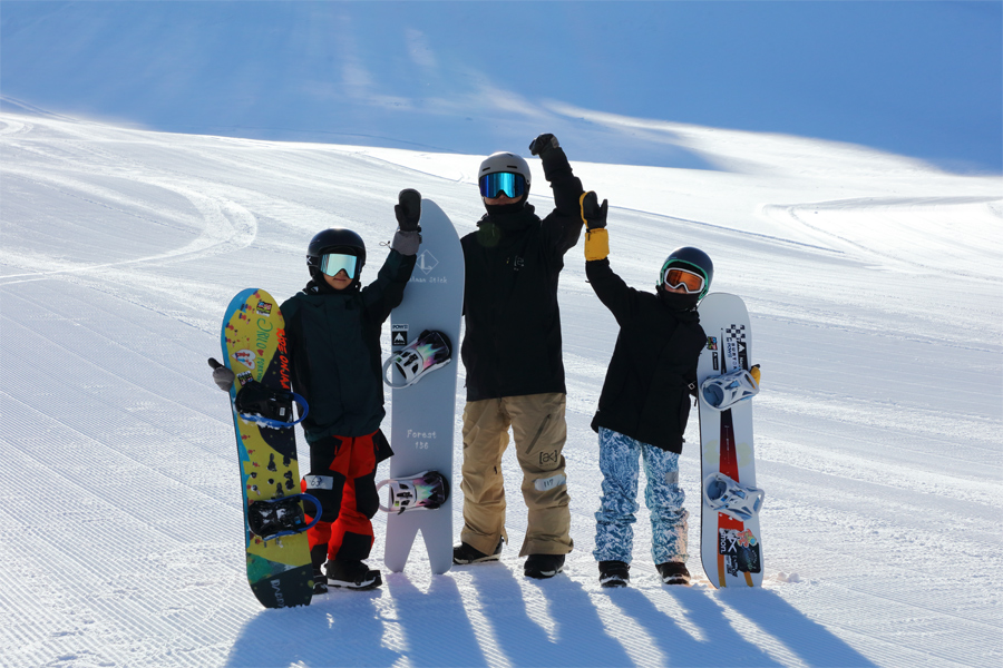 上田市からのお父さん(写真中央)が「いつも見てます!シーズン券を買ってニンジャをホームゲレンデにしています。今日は息子(写真左)とそのお友達(写真右)と一緒に大会に参加します。」とお話くださいました。よく締まった湿雪の圧雪のブラックビート(写真)では選手たちがウォーミングアップしていました。