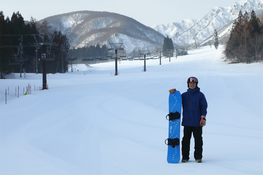 Slopes をご紹介するのに「今日はいいもりゲレンデに、モンスタークリフ の 佐藤さん、THE DAY.HAKUBA のテストライダーさん(写真、以下「Tさん」)、レポーターの3人が集合して、途中で分かれて滑って、SLOPES を使って再会する」というストーリーを描いていました。それが、佐藤さんが本気の遅刻。暖かな今朝はバーンが荒れ始めるのが早いと読んで、佐藤さんを待たずに2人で取材に出かけました。