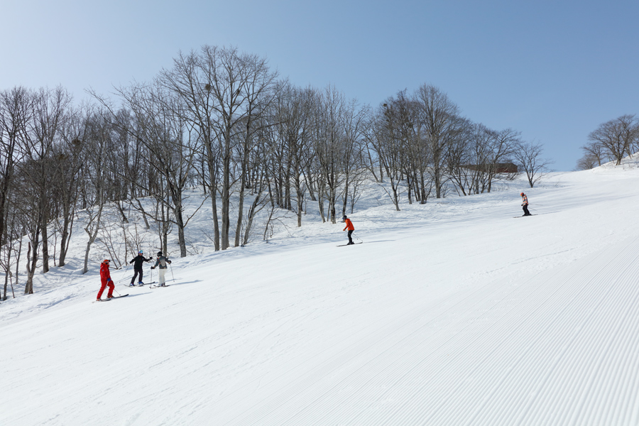ユートピアAコースとBコースは9時オープンのため、先にパノラマコースやカラマツコースを1~2本滑ってからでもきれいなバーンを楽しめます。このあとくまどー第4トリプルで上り返して、適度に締まったザラメ雪の圧雪のユートピアBコースも滑りました。