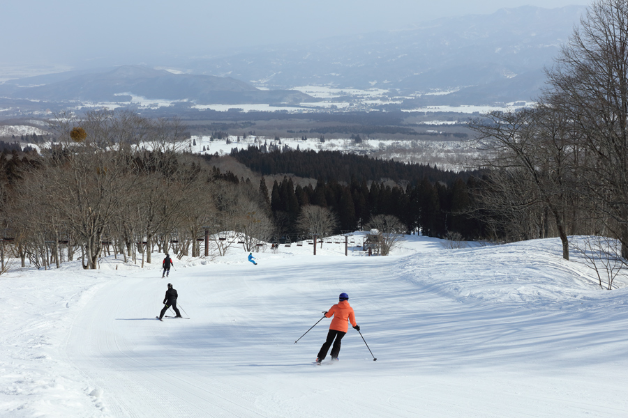 緩斜面が半分以上を占める 赤倉温泉スキー場 には穏やかな晴天が似合います。今朝も風のない、日差しが心地よく感じられるポカポカ陽気でした。朝方のパノラマコースとユートピアAコース(写真)は適度に締まった、滑りやすいザラメ雪の圧雪でした。