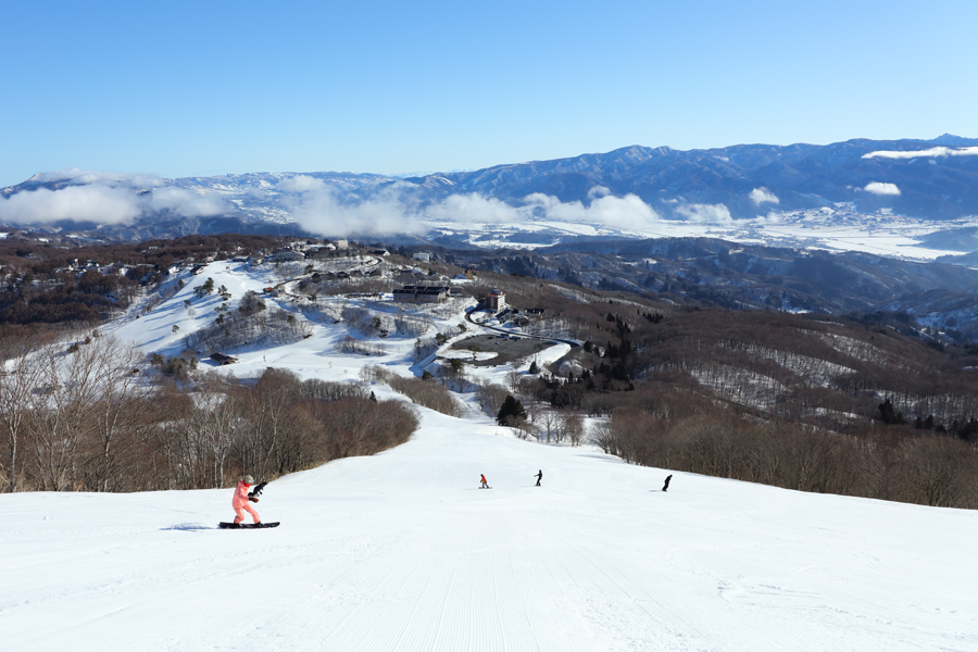 営業開始直前までピステンが入っていたジャイアントは緩んだザラメ雪の圧雪でした。「普段は湯沢エリアに行くことが多いのですが、2年ぶりに斑尾にやって来ました。」とは東京都からの男性(写真左、ピンクのウエア)。チャンピオンで大パノラマと、板の走る緩んだザラメ雪の圧雪バーンを楽しみました。