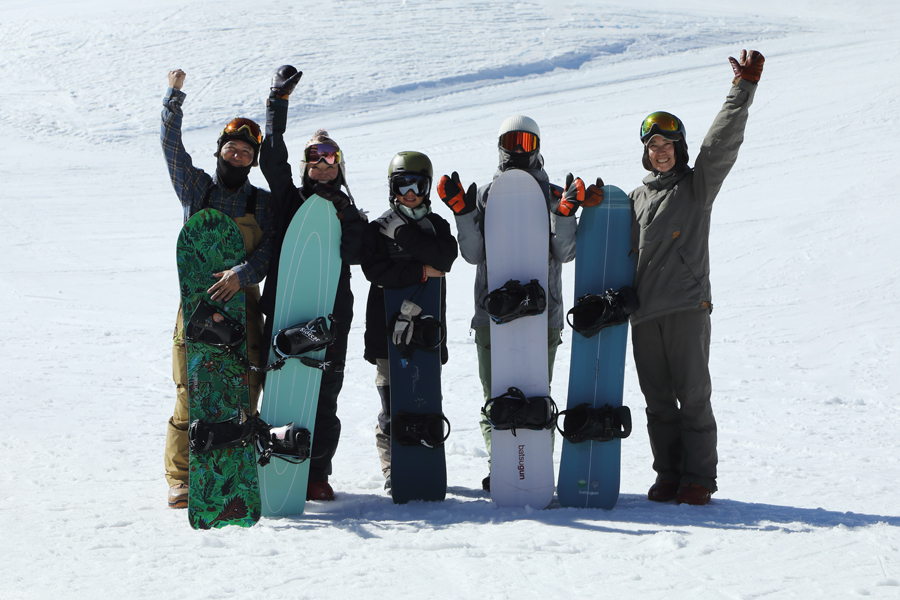 その後、第2初級コースで幅の広さを生かして大回りを展開しました。先ほどお会いした千葉県からのご夫婦(写真左のお2人)が「県内からの友人家族(写真右の3名様)と合流しました。志賀高原の雪質が好きで、シーズン券を買って通っています。特に熊の湯の雰囲気がお気に入りです。」とお話くださいました。