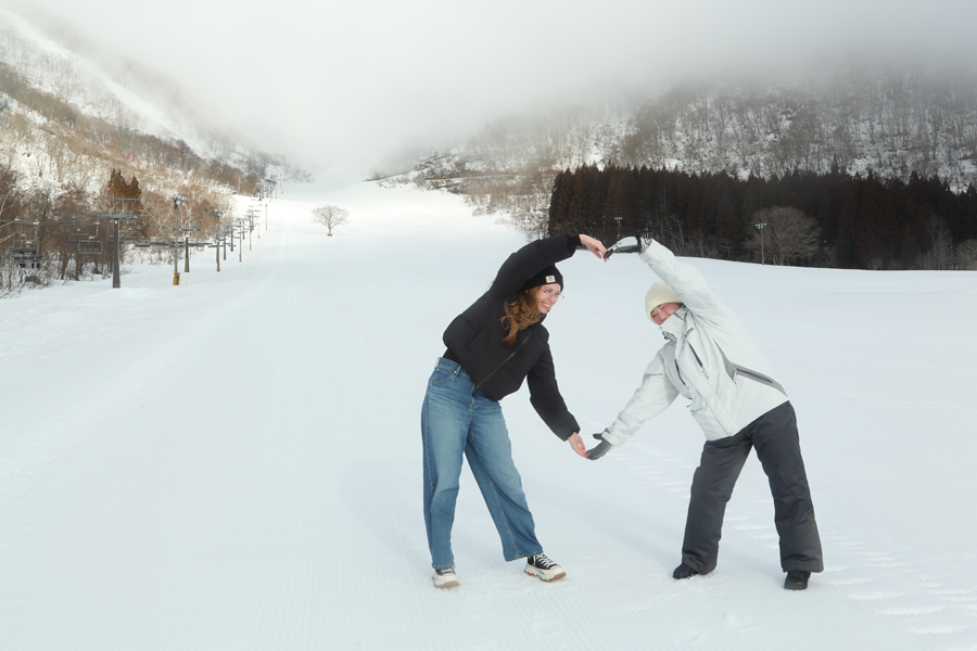 営業開始前にお会いしたのは兵庫県と大阪府からのお2人(写真、お1人はカナダ人、お1人は日本人)。「日帰りのバスツアーで初めてコルチナに滑りに来ました。実はスノーボードも今日が初めてなので、コルチナスキー学校 の無料ワンポイントレッスンを受けようと思います。ホテルの温泉も楽しみです。」とお話しくださいました。